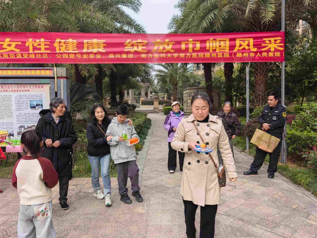 春风送暖,芳华竞绽;巾帼逐光,共庆佳节。为庆祝第116个“三八”国际妇女节,深入践行关爱女性理念,切实守护小区女性业主身心健康,丰富小区文化生活,彰显新时代女性巾帼风采,3月7日上午,燕兴集团携手南方医科大学南方医院赣州医院(赣州市人民医院)、水南街道登峰社区、小区业委会开展“呵护女性健康 绽放巾帼风采”庆“三八”专场活动。小区女性同胞欢聚一堂,共赴春日之约,在温情暖意中感受多方关怀与节日喜悦。